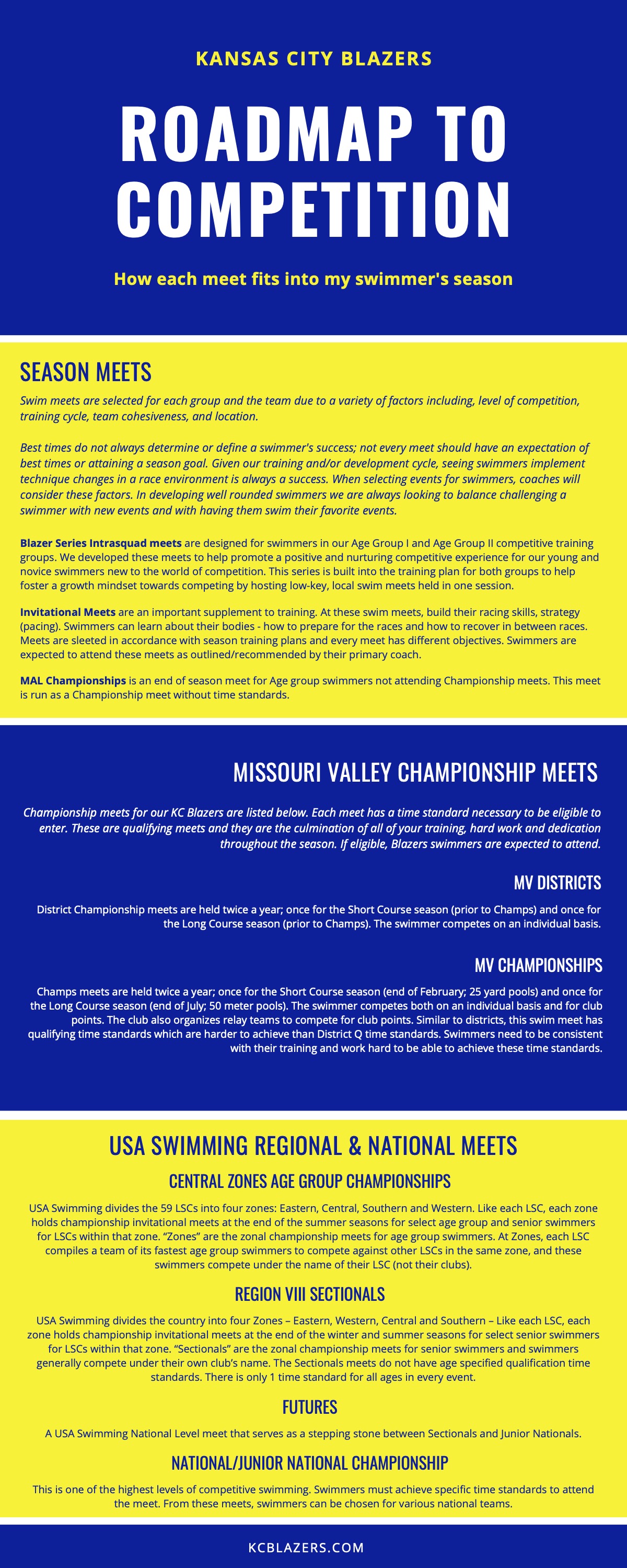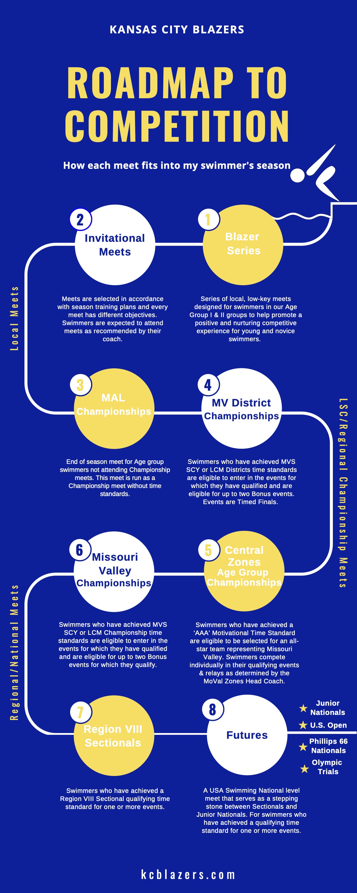 Whether you are new to the world of competitive swimming or the Kansas City Blazers Swim Team, take a look at our Roadmap to Competition which provides some insight on: